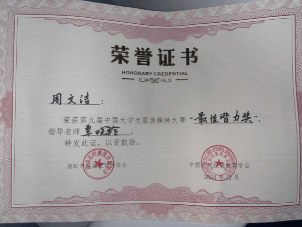 非常榮幸能夠在第九屆大學生服裝模特大賽中獲得“最佳潛力獎”。感謝學校給我提供了這次比賽機會,同時也非常感謝我的學院領導和老師們的培養(yǎng)與支持,是她們的鼓勵讓我勇敢地走出舒適區(qū),去嘗試,去突破。