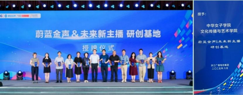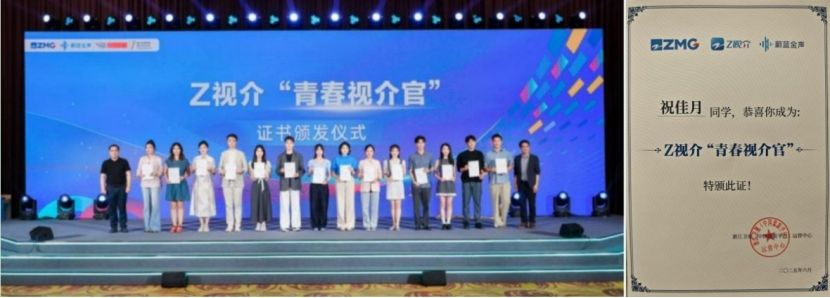 會上,浙江廣電集團(tuán)授予我校文化傳播與藝術(shù)學(xué)院“蔚藍(lán)金聲&未來新主播研創(chuàng)基地”稱號。我校播音與主持藝術(shù)專業(yè)2022級本科生祝佳月受邀入駐浙江廣電集團(tuán)人才孵化基地,獲頒“Z 視介”青春視介官證書。她表示將以此為新起點(diǎn),用足用好平臺資源,在實(shí)踐中成長,創(chuàng)作好作品,傳遞時代新聲。