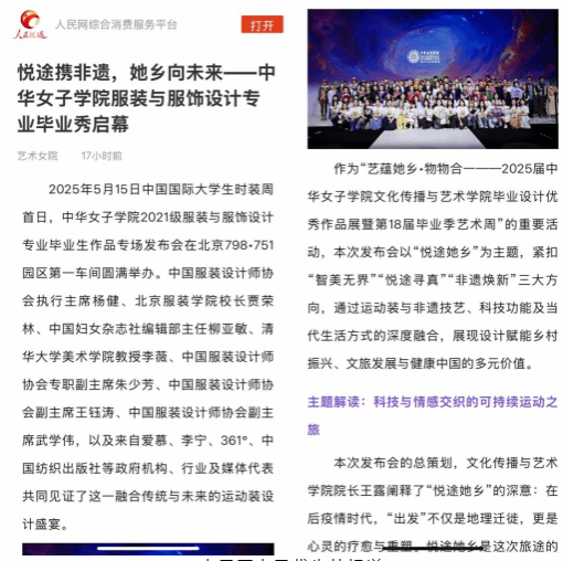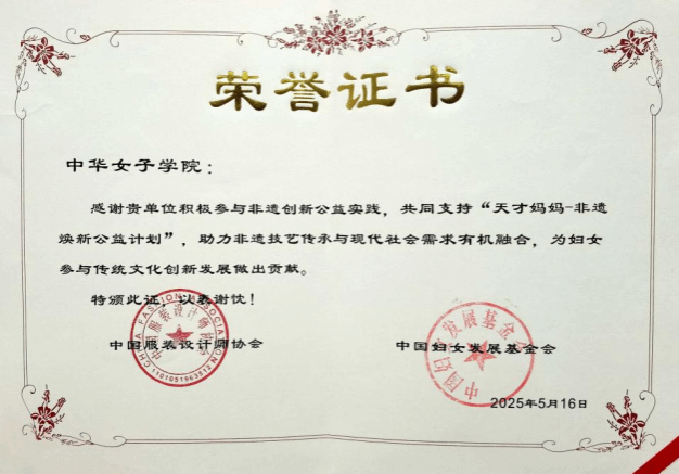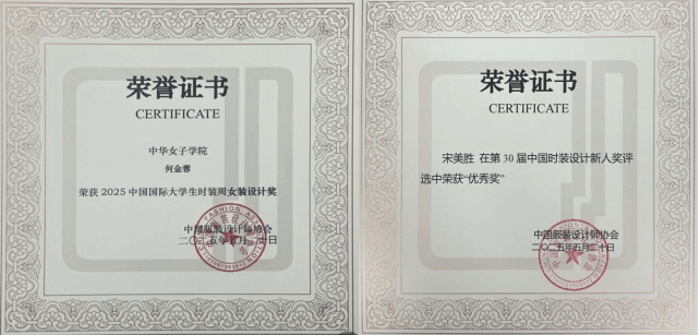 本次畢業(yè)季,我院學子不僅在畢業(yè)大秀上大放異彩,更在多項權(quán)威賽事中捷報頻傳,碩果累累,以優(yōu)異成績?yōu)閲壹壱涣鲗I(yè)建設(shè)遞交完美答卷。中華女子學院斬獲“2025中國國際大學生時裝周人才培養(yǎng)成果獎”;助力“天才媽媽-非遺煥新公益計劃”獲貢獻獎。
