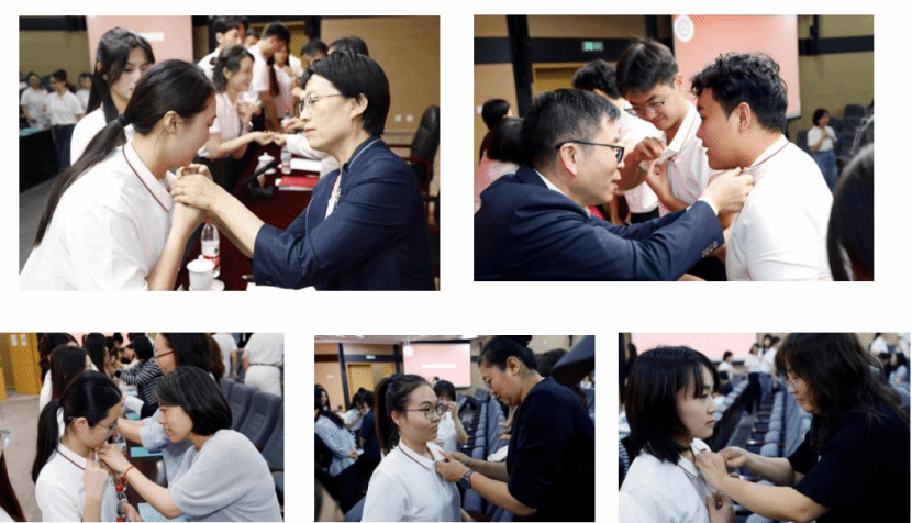 在悠揚的校歌聲中,最為激動人心的環節到來——為新生佩戴校徽。校領導與老師們為新生代表逐一佩戴上熠熠生輝的校徽。校徽不僅是學子身份的象征,更承載著學校的傳統、精神和期望,寓意著榮譽與責任并重。戴上校徽,象征著同學們與學校血脈相連,共同奮進。