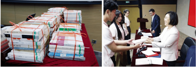書香潤心、知識賦能。典禮中特別設置了“哲思潤新·文史伴行:首書借閱”的特殊環節。為助力同學們開啟學術探索之旅,學校圖書館精心為每位新同學準備了首本借閱書籍。新生代表從校領導和圖書館館長、教務部部長手中接過的首本借閱書,寄托了老師們的殷切期望,希望同學們多讀書,讀好書,廣博學識,涵養心性,在書海中汲取智慧與力量。