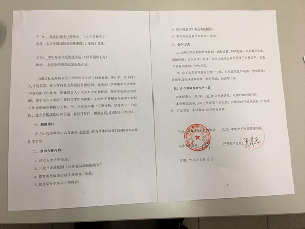 北京注冊會計師協會與中華女子學院管理學院雙方本著“互惠互利、培養人才”的宗旨,建立長期戰略伙伴關系。中華女子學院管理學院與北京注冊會計師協會簽署了合作培養人才的框架協議。雙方將在建立人才培養基地、開展“走進校園-CPA職業基礎技能培訓”、推薦考核成績合格學員實習與就業;聯合舉辦專場人才招聘會、聯合開展CPA考試考前輔導、聯合舉辦行業學術會議與論壇等方面展開深入合作。涉及培訓項目將由北京注冊會計師協會負責制定教學計劃、課程設置、師資配備;負責教學實施、班級管理、組織考試、面試;負責為成績合格學員授予合格證書;負責審核宣傳資料、宣傳方式。