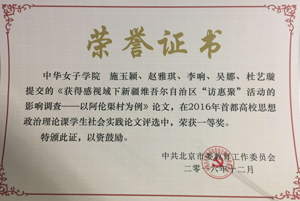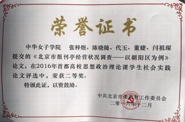 為貫徹教育部和北京市關于加強思想政治理論課建設的精神,充分發揮社會實踐在思想政治理論課教學中的作用,引導學生在實踐中深化理論認識,推進完善思想政治理論課實踐教學機制,我校思想政治理論教學部繼續積極組織學生參加思政課社會實踐調研活動,并選報優秀學生論文參加首都高校思想政治理論課學生社會實踐優秀論文評選。經過評選,我校劉旸老師指導的《獲得感視域下新疆維吾爾自治區“訪惠聚”活動的影響調查——以阿倫渠村為例》一文獲北京市一等獎,苗偉東老師老師指導的《北京市報刊亭經營狀況調查——以朝陽區為例》一文獲得北京市二等獎。