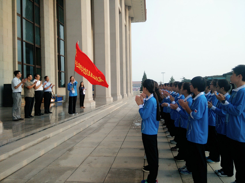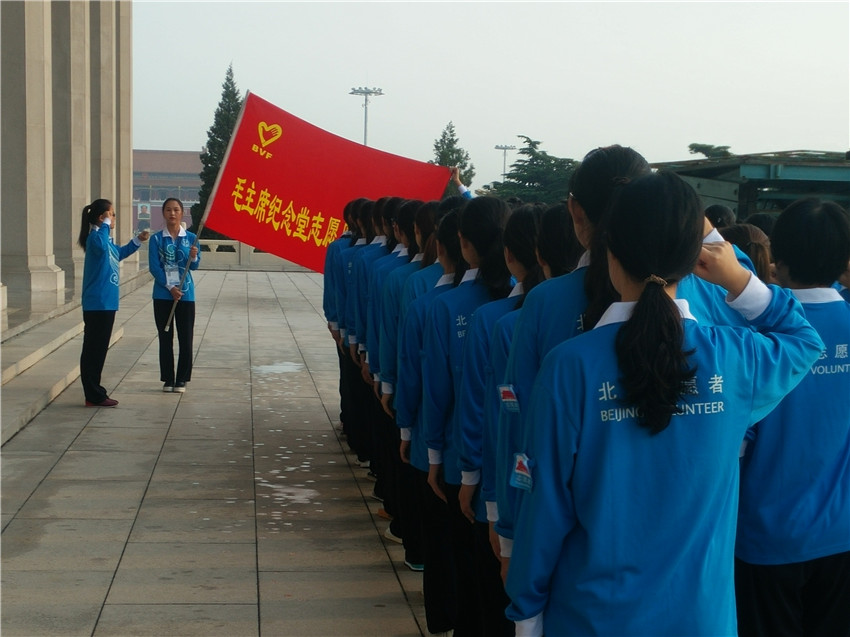 2015年8月8日清晨六點半,我校46名志愿者整齊列隊參加2015年第九批次大學系統毛主席紀念堂志愿服務項目上崗儀式。共青團北京市委員會機關黨委書記、北京市志愿服務指導中心主任郭新保,共青團北京市委員會大學部副部長郭昊,毛主席紀念堂管理局接待處處長馬恒祥、我校北校區管理辦公室副主任楊曉峰、團委負責老師參加儀式。