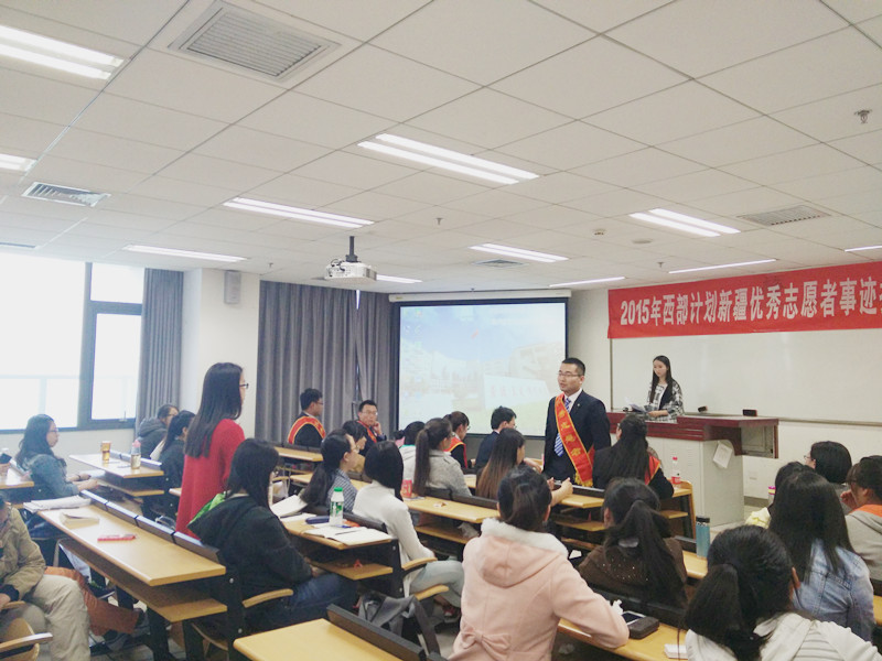 2015年4月21日下午,“奮斗的青春最美麗”2015年大學生志愿服務西部計劃新疆優秀志愿者事跡報告會在我校順利舉行。烏魯木齊高新區財政局國資中心副主任王樹光,北京市志愿服務指導中心項目部于鑫,北京航空航天大學研支團賈澤浩,新疆麥蓋提縣工商聯孫夢玲,新疆木壘縣廣播電視局黑宏偉,新疆烏魯木齊高新區公安局王舉光,新疆昌吉州團委馮寶森以及各院系學生代表參加報告會。