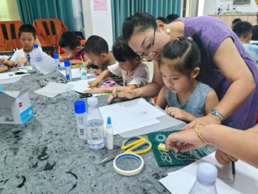 馬麗娜博士在連城縣栗園社區(qū)和長(zhǎng)汀縣騰飛社區(qū)分別組織《紙版畫制作與印刷》《兒童自由水墨畫》親子美育活動(dòng),從傳統(tǒng)技藝的歷史溯源到拓印的創(chuàng)意實(shí)踐,孩子們?cè)谟∷⑴c拓印、水墨與顏料的交匯中積極投入活動(dòng),表現(xiàn)出了高度認(rèn)可和由衷喜愛。