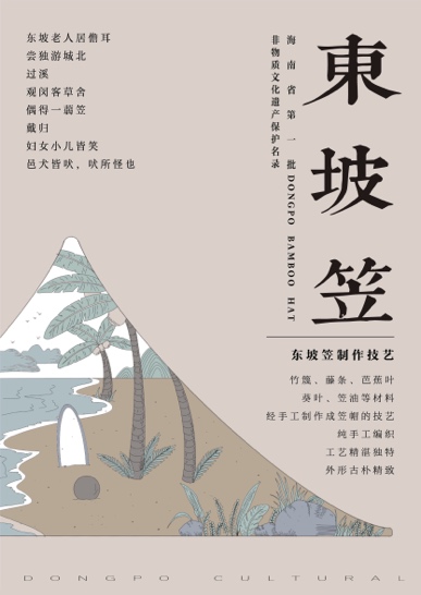 設計理念:東坡笠是海南一顆璀璨“恒星”。當我們的手指拂過東坡笠,這早已融入歲月長河的器物,不僅見證著日常生活,也訴說著文化傳承的百姓故事。這組海報設計以東坡笠為載體,運用海南人文與自然元素,取其經典的自然風光與人文景觀進行視覺表現,以此宣傳東坡笠這項非物質文化遺產。
