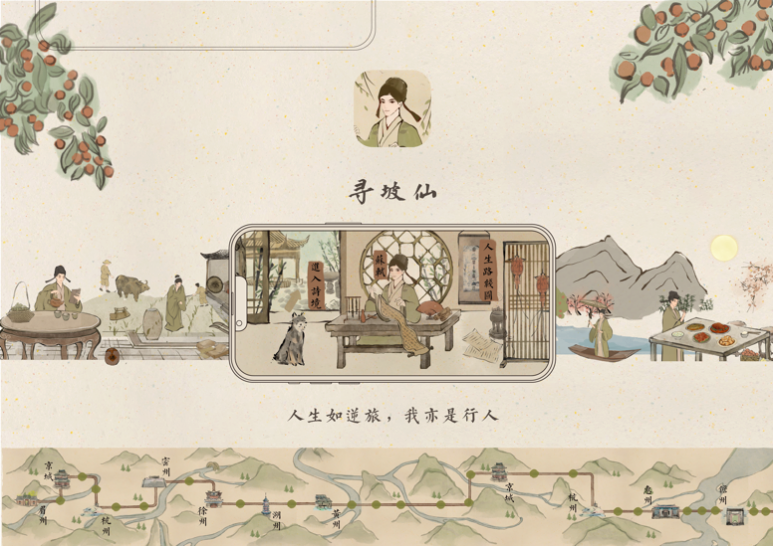 設計理念:《尋坡仙APP》圍繞蘇東坡的生平、詩詞、書畫、成就和人際關系五個方面展開交互游戲創作,使用戶在交互中認識蘇軾,了解他的人生意義、作品成就、思想價值以及在文學藝術史上的地位和影響。同時以人生路線圖的方式展現了蘇軾一生足跡踏過的地理風貌,以促進相關地區的文化旅游業發展。該作品希望用戶能夠體會和領悟東坡精神及人格魅力,即超然的審美、灑脫的人生、智慧的觀照、實干的精神、親和的人性等。