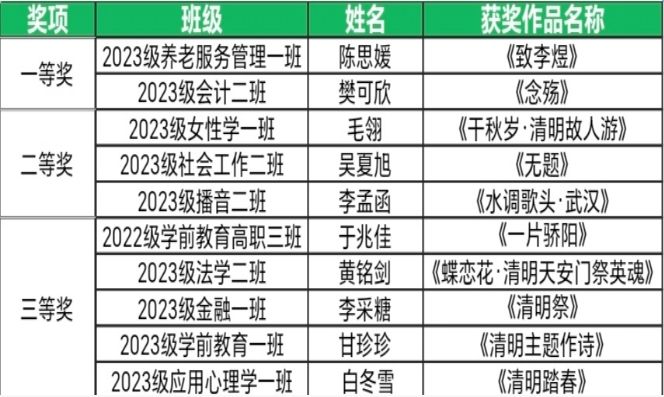 在本次活動中,同學(xué)們以踏青游春、祭祖習(xí)俗、緬懷先烈等為主題,創(chuàng)作原創(chuàng)詩歌,于詩詞中感受春天的生機,同時活動還意在追思先烈,弘揚民族精神,厚植愛國情懷。北校區(qū)共有23個作品參與選拔,其中經(jīng)過清明詩會工作小組匿名投票選出10個作品進入復(fù)賽,北校區(qū)教師評委組圍繞詩歌作品的立意是否高遠(yuǎn)、是否緊扣主題,內(nèi)容是否積極向上,文字表達是否飽滿真摯等方面進行評議,最終選出一、二、三等獎。具體獎項人數(shù)及獲獎名單如下: