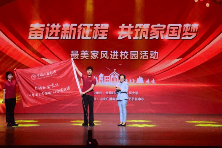 10月24日,由全國婦聯主辦的“奮進新征程 共筑家國夢”最美家風進校園活動在京舉辦。國務委員、全國婦聯主席諶貽琴對深化尋找“最美家庭”活動、推進最美家風進校園,引領廣大青年厚植家國情懷,為強國建設、民族復興偉業貢獻青春力量提出明確要求。活動現場,全國婦聯黨組書記、副主席、書記處第一書記黃曉薇為中國人民大學成立“千家萬戶幸福路”學生社會實踐團授旗,勉勵青年學子胸懷家國天下、弘揚時代新風,把青春之歌寫在中國大地上。