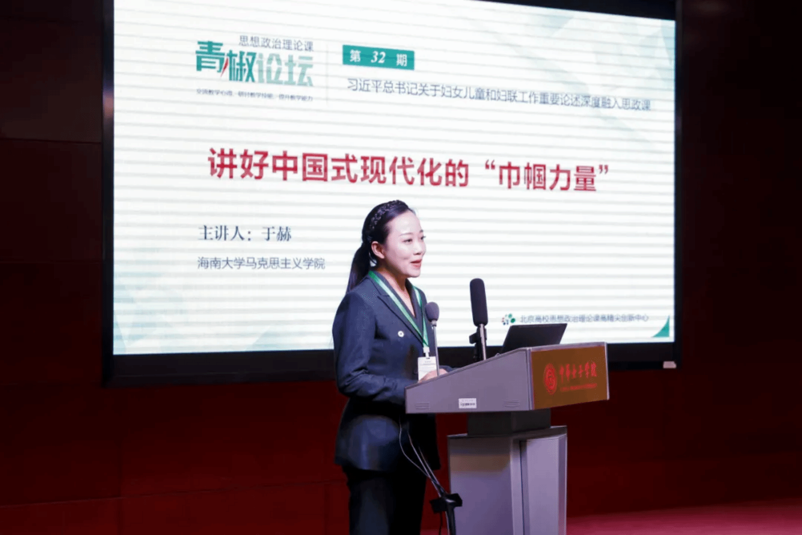 第六屆全國高校青年教師教學(xué)競賽思政課組一等獎(jiǎng)獲得者、海南大學(xué)馬克思主義學(xué)院于赫副教授以“中國式現(xiàn)代化中的巾幗力量”為題,對(duì)習(xí)近平總書記關(guān)于婦女兒童和婦聯(lián)工作重要論述深度融入“習(xí)近平新時(shí)代中國特色社會(huì)主義思想概論”課教學(xué)提出了思考。
