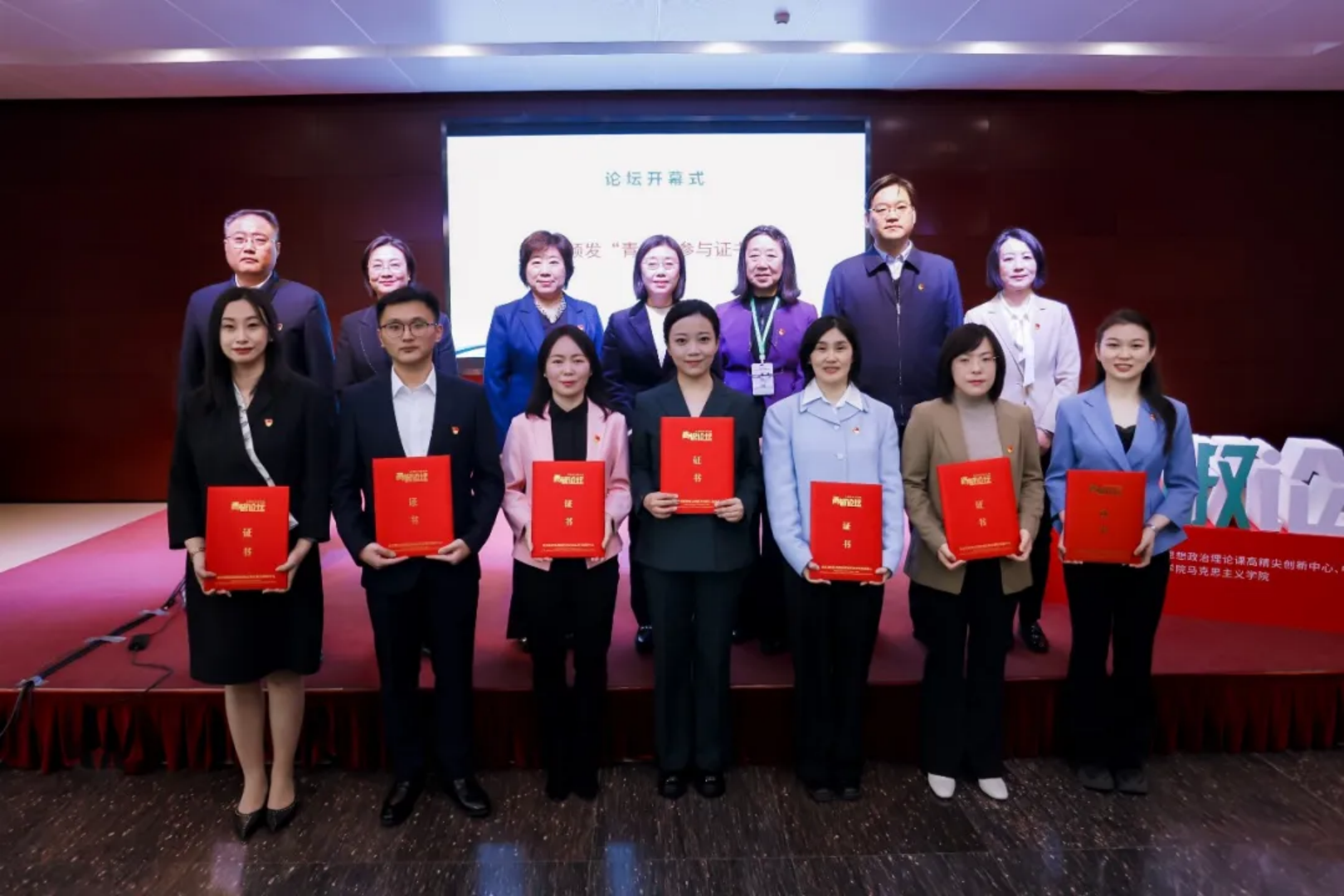 全國婦聯(lián)婦女研究所所長杜潔,全國婦聯(lián)宣傳部副部長王秀江,北京婦聯(lián)黨組成員、副主席趙紅偉,中國人民大學(xué)黨委常委、副校長王易,中華女子學(xué)院黨委書記、院長劉利群,湖南女子學(xué)院黨委書記段美娟,山東女子學(xué)院副書記龍希利等七位領(lǐng)導(dǎo)向七位“青椒”頒發(fā)青椒論壇參與證書。
