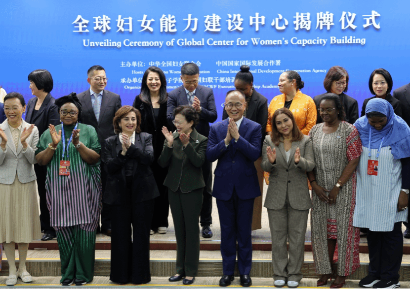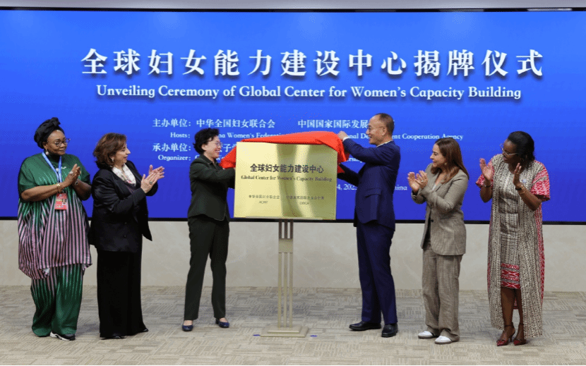 全國婦聯黨組書記、副主席、書記處第一書記黃曉薇(左三)與國家國際發展合作署黨組書記、署長陳曉東(右三)為全球婦女能力建設中心揭牌。中國日報記者 王壯飛 攝