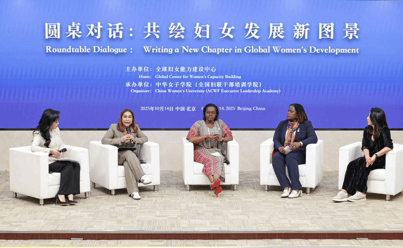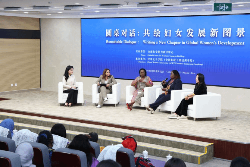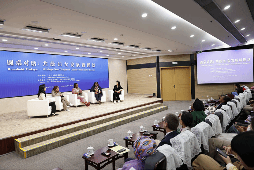 ↑ 10月14日,與會嘉賓在“全球婦女能力建設中心”揭牌儀式后進行圓桌對話。
