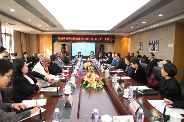 努卡女士在演講中高度贊揚習近平主席和中國政府對全球婦女發展的重視和支持,高度評價中國婦女發展成就,認為中國在國際婦女發展中具有引領力量,中國婦女發展經驗值得國際社會和各國學習。她感謝中華女子學院在促進世界性別平等知識的學習、研究及實踐方面所發揮的杰出領導作用;感謝學校為中國及其他國家的年輕女性提供的學習機會。她稱贊中華女子學院是一顆閃耀的明星,擁有卓越的領導力,致力于推動女性教育、維護婦女權益,幫助實現2030年可持續發展目標,這是對世界婦女發展的重要貢獻。她表示年輕人應發揮最大的潛力改變女性在世界的地位,推動世界性別平等。她希望越來越多的年輕人能掌握和充分利用現代科技,團結其它貧困地區的女性,幫助弱勢群體更好地發展,實現世界男女平等、共同繁榮。努卡女士還希望女子學院繼續在學術研究方面發揮領導地位,特別是在性別平等領域做出更大的貢獻。她表示,聯合國婦女署愿與學校加強合作,共同推進世界婦女共同發展、全面發展。