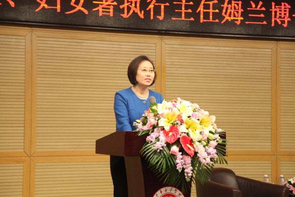 劉利群主持演講和榮譽教授授予儀式。活動在段伯毅老師帶領學校紅帆合唱團精心準備的合唱節目中拉開了序幕。李明舜致歡迎詞。他代表學校全體師生向努卡女士一行到訪表示熱烈地歡迎。他指出,學校在女性和性別領域有獨特的研究視角和優勢,學校積極參與婦女權益保護立法和國家婦女政策的制訂,發揮了婦女工作智庫作用,在促進全球婦女發展方面也發揮獨特的重要作用。他說:“努卡女士致力于追求男女平等這一偉大的事業,積極推動消除性別歧視和性別暴力,為人類的美好和幸福做出了卓越貢獻,是杰出女性的典范,是大家學習的榜樣!”他希望通過努卡女士的來訪,進一步加深學校與聯合國婦女署的聯系,在推動全球性別平等上發揮更大作用,為促進女性發展和社會進步作出更大貢獻。