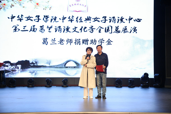 在“我與誦讀”展演環(huán)節(jié),來自山西長治的毛行云老師在舞臺上接受了主持人采訪,為我們講述了他是如何被葛老藝術(shù)吸引,在葛老精神的感召下,到山區(qū)去推廣和普及經(jīng)典誦讀的動人故事。隨后,葛蘭老師為來自山區(qū)的32名小選手頒發(fā)了“葛蘭助學金”,把展演活動推向了高潮。