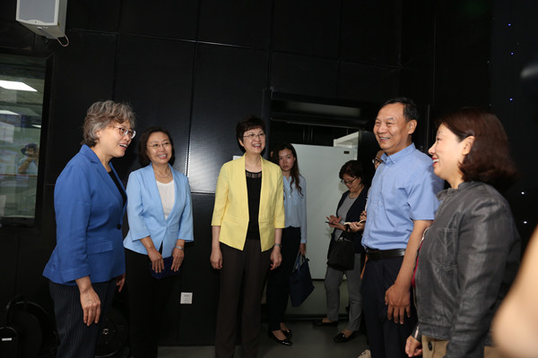 在文化傳播學院演播室,黃曉薇一行了解了演播室在專業教學中發揮的作用和承擔的教學任務,觀看了學生主持、制作全國婦聯女性之聲《新聞聯播》節目的現場,黃曉薇說:“要辦好女性之聲,引領廣大婦女聽黨話跟黨走。”