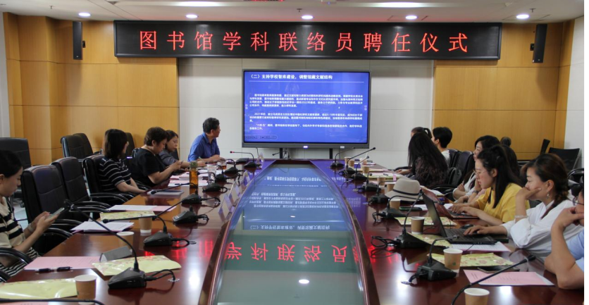 儀式上,圖書館館長馬良教授首先作了題為《圖書館事業(yè)發(fā)展規(guī)劃和中期設(shè)想》的報告,旨在讓首次加入圖書館學(xué)科聯(lián)絡(luò)員隊伍的專業(yè)老師們了解圖書館未來的發(fā)展規(guī)劃,鼓勵聯(lián)絡(luò)員們發(fā)揮專業(yè)優(yōu)勢,助力所在學(xué)科的文獻資源建設(shè)和應(yīng)用推廣。文獻資源建設(shè)部主任趙燦匯報了館藏文獻資源的概況,信息咨詢部主任張立省與老師們分享了圖書館服務(wù)教學(xué)科研工作的情況,讓大家對圖書館館藏資源和具體業(yè)務(wù)工作有了進一步了解。