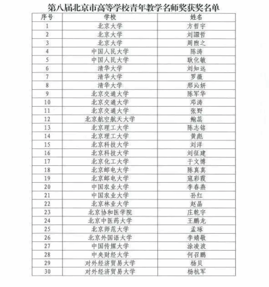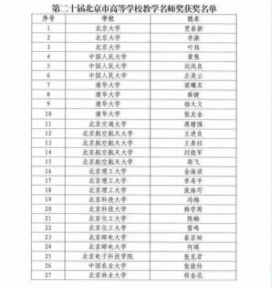 近日,北京市教委網站公布2024年度北京市高等學校教學名師獎獲獎名單。經學校推薦、評審專家組評議、評審委員會投票、市教委審核并公示,決定授予北京大學賈春新等89名教師第二十屆北京市高等學校教學名師獎、清華大學劉知遠等75名教師第八屆北京市高等學校青年教學名師獎。