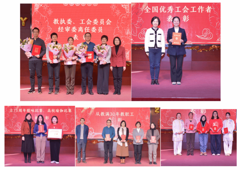 趙浩主席總結了工會2024年重點工作并為教執委、工會委員會和經審委離任委員頒獎。邢慧麗副書記、葉水平常委為全國優秀工會工作者和2024年從教滿30年教職工頒獎。工會專兼職副主席陳麗君、張小紅為中直機關歌詠比賽和高校瑜伽比賽獲獎代表以及優秀文體社團頒獎。