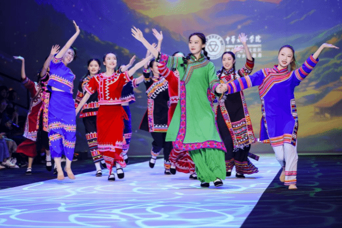 本次畢業(yè)秀還精心設(shè)置“驚喜彩蛋”,在全國三八紅旗手標(biāo)兵、瀾滄縣拉祜族擺舞非遺文化傳承人李娜倮的動人歌聲中,身穿拉祜族服飾的表演專業(yè)學(xué)生動情舞蹈,以“動態(tài)活化”替代“靜態(tài)陳列”。擺舞的律動與運動裝的機能美學(xué)共振,非遺歌謠的韻律融入時裝秀的光影節(jié)奏,讓青年設(shè)計師深切感知民族服飾是可穿戴、可對話的“活態(tài)文化”,讓千年文明在當(dāng)代時尚生活中持續(xù)生長。