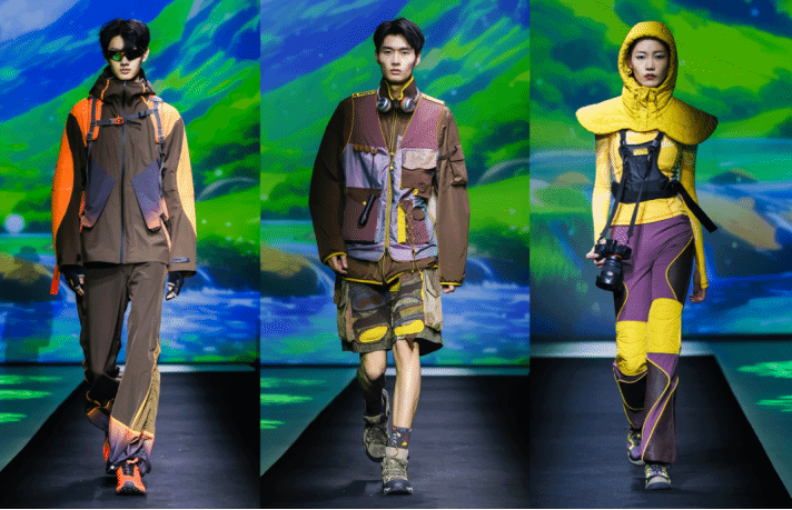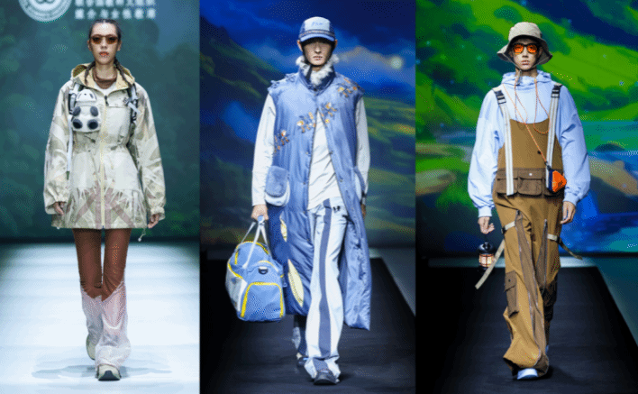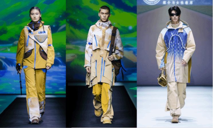 此外,學(xué)生關(guān)注以青年視角解構(gòu)戶外美學(xué),將運動時尚與當(dāng)代生活方式巧妙結(jié)合,營造“自然療愈”的輕松氛圍,鼓勵青年群體在自然中釋放壓力,體現(xiàn)Z世代對生態(tài)友好與情感聯(lián)結(jié)的追求。例如,露營服裝系列通過大地色系與解構(gòu)主義廓形,傳遞“慢生活”哲學(xué);戶外徒步系列將地質(zhì)元素、毛氈工藝與紅色旅游元素結(jié)合,彰顯功能時尚與文化認同。設(shè)計師以戶外運動敘事記錄旅途感悟,用服裝詮釋“出發(fā)即抵達”的生命態(tài)度。