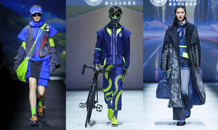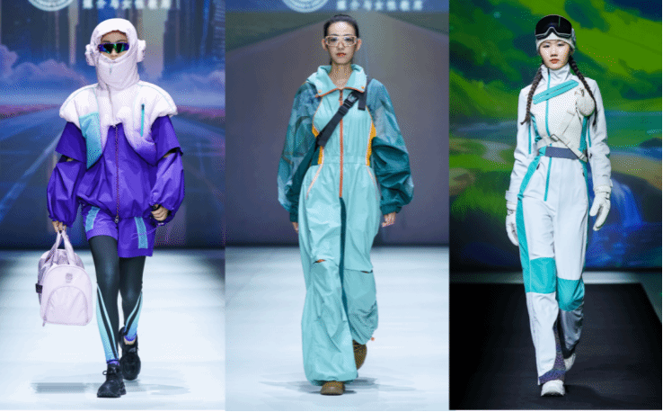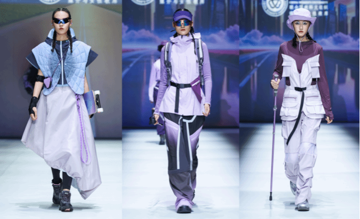 數(shù)智時代,運動裝設(shè)計彰顯科技與時尚的共振。畢業(yè)生通過市場調(diào)研及綜合設(shè)計構(gòu)思,打造適應(yīng)多場景切換的功能性服裝。例如,設(shè)計融入環(huán)保面料與一體織針織工藝,以流暢剪裁呼應(yīng)人體工學(xué);采用模塊化設(shè)計,結(jié)合層系統(tǒng)模式,兼顧運動功能與時尚變裝,使得服裝能夠靈活適應(yīng)用戶不同場景的穿衣需求。這些作品呼應(yīng)全球運動裝智能化趨勢,為中國設(shè)計在材料創(chuàng)新應(yīng)用與可持續(xù)設(shè)計領(lǐng)域的發(fā)展助力。