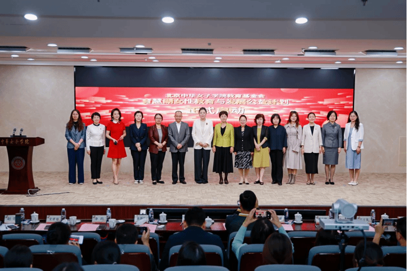 與會嘉賓、校領(lǐng)導及北京中華女子學院教育基金會部分理事上臺共同啟動“育慧湖女性教育與發(fā)展公益計劃”。