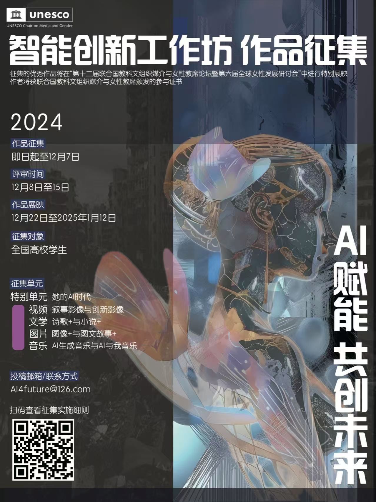 本次工作坊設置四個征集單元和一個特別單元,征集單元旨在探索AI技術與多元媒介創作實踐,特別單元鼓勵女性創作者在AI技術與藝術融合的探索中展示獨特視角和創意風采。我們期望為參與者提供展示創意與技術的機會和平臺,鼓勵參與者在AI技術的助力之下,突破傳統創作邊界,開創全新的藝術表現形式。本次征集的優秀作品將在2024年12月21日至22日舉辦的“智能·平等·創新:數字賦能與全球女性發展第十二屆聯合國教科文組織媒介與女性教席論壇暨第六屆全球女性發展研討會”中進行特別展映,作者將獲得聯合國教科文組織媒介與女性教席頒發的參會證書。