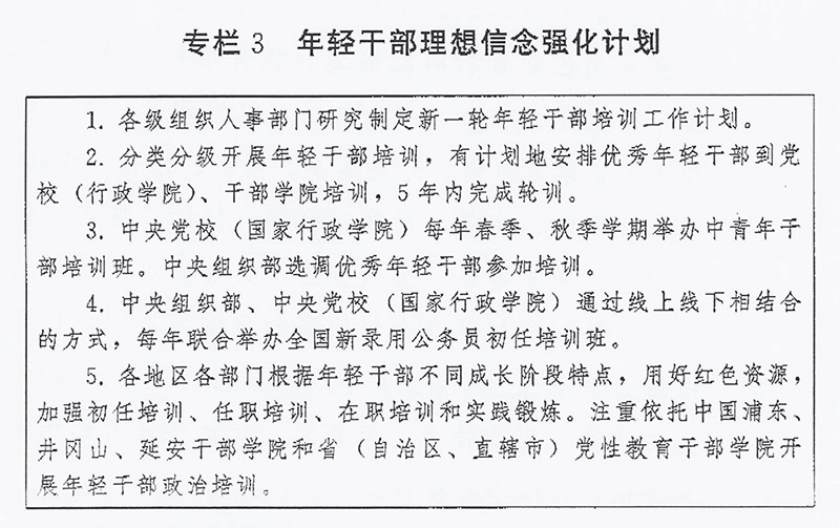(三)加強(qiáng)年輕干部政治訓(xùn)練。強(qiáng)化習(xí)近平新時(shí)代中國(guó)特色社會(huì)主義思想學(xué)習(xí)教育,突出政治忠誠(chéng)教育、理想信念教育、紀(jì)律規(guī)矩教育,加強(qiáng)優(yōu)良傳統(tǒng)作風(fēng)和責(zé)任感使命感教育,強(qiáng)化斗爭(zhēng)意識(shí),綜合運(yùn)用理論講授、政策解讀、案例教學(xué)、現(xiàn)場(chǎng)體驗(yàn)等方式開展系統(tǒng)培訓(xùn)。黨委(黨組)負(fù)責(zé)同志要講好“開班第一課”。安排思想政治素質(zhì)過(guò)硬、理論水平較高、實(shí)踐經(jīng)驗(yàn)豐富的領(lǐng)導(dǎo)干部上講臺(tái)授課。探索推行“政治輔導(dǎo)員”、“導(dǎo)師幫帶”制度。通過(guò)開展黨性分析、實(shí)踐鍛煉、過(guò)“政治生日”、重溫入黨誓詞等方式,錘煉黨性修養(yǎng)、提高政治覺悟。實(shí)施年輕干部理想信念強(qiáng)化計(jì)劃(專欄3)。