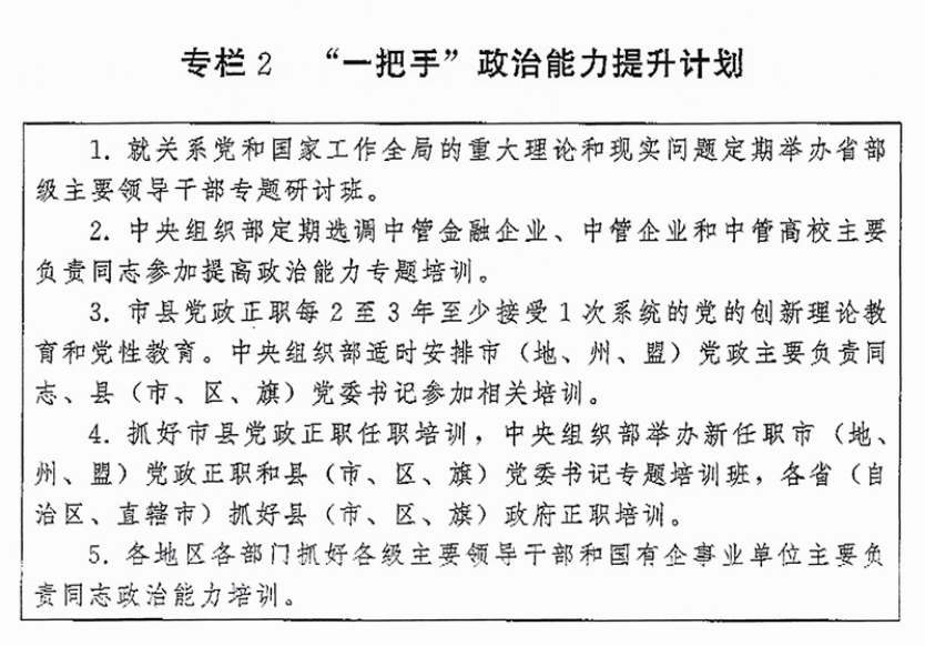 (二)突出“關(guān)鍵少數(shù)”政治訓(xùn)練。堅(jiān)持把政治訓(xùn)練貫穿干部成長(zhǎng)全周期,使干部的政治素養(yǎng)、政治能力與擔(dān)負(fù)的領(lǐng)導(dǎo)職責(zé)相匹配。強(qiáng)化“一把手”政治培訓(xùn),有計(jì)劃地選調(diào)地方、部門、國(guó)有企事業(yè)單位主要負(fù)責(zé)同志到黨校(行政學(xué)院)、干部學(xué)院參加專題培訓(xùn)。實(shí)施“一把手”政治能力提升計(jì)劃(專欄2)。省(自治區(qū)、直轄市)、市(地、州、盟)、縣(市、區(qū)、旗)黨政領(lǐng)導(dǎo)班子成員每2至3年到黨校(行政學(xué)院)、干部學(xué)院至少接受1次系統(tǒng)的黨的創(chuàng)新理論教育和黨性教育,5年內(nèi)累計(jì)不少于2個(gè)月。圍繞提高政治能力和領(lǐng)導(dǎo)能力,加強(qiáng)機(jī)關(guān)司局長(zhǎng)、處長(zhǎng)任職培訓(xùn)。重視對(duì)女干部、少數(shù)民族干部、黨外干部等的政治培訓(xùn)。加強(qiáng)對(duì)高層次人才的政治引領(lǐng),中央組織部會(huì)同有關(guān)單位每年組織一定數(shù)量人才開展國(guó)情研修。