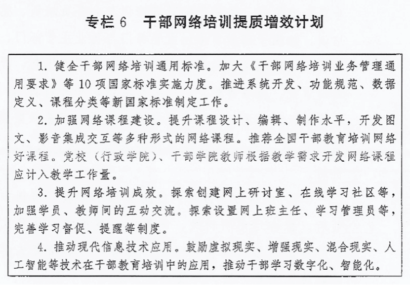 (二)加強(qiáng)網(wǎng)絡(luò)培訓(xùn)課程建設(shè)。鼓勵(lì)黨校(行政學(xué)院)、干部學(xué)院和部門、企業(yè)、高校等組織開發(fā)精品網(wǎng)絡(luò)課程。注重把握網(wǎng)絡(luò)教學(xué)特點(diǎn)和規(guī)律,改進(jìn)授課方式,提高制作水平,豐富呈現(xiàn)形式,提升課程質(zhì)量。嚴(yán)把網(wǎng)絡(luò)課程政治關(guān)、質(zhì)量關(guān),規(guī)范講授、制作、審核、發(fā)布和更新、退出流程。充分發(fā)揮網(wǎng)絡(luò)培訓(xùn)優(yōu)勢(shì),推動(dòng)優(yōu)質(zhì)資源下基層。用好網(wǎng)絡(luò)直播培訓(xùn)形式,增強(qiáng)現(xiàn)場(chǎng)體驗(yàn)感。實(shí)施干部網(wǎng)絡(luò)培訓(xùn)提質(zhì)增效計(jì)劃(專欄6)。