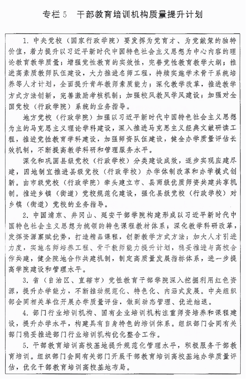 (一)培訓(xùn)機(jī)構(gòu)建設(shè)。推進(jìn)各級(jí)黨校(行政學(xué)院)建設(shè),以教學(xué)督導(dǎo)、師資培養(yǎng)、質(zhì)量評(píng)估為重點(diǎn),強(qiáng)化上級(jí)黨校(行政學(xué)院)對(duì)下級(jí)黨校(行政學(xué)院)的業(yè)務(wù)指導(dǎo),不斷提高辦學(xué)水平。推進(jìn)縣級(jí)黨校(行政學(xué)校)分類建設(shè)。加強(qiáng)社會(huì)主義學(xué)院建設(shè)。進(jìn)一步提升部門行業(yè)培訓(xùn)機(jī)構(gòu)、國(guó)有企業(yè)培訓(xùn)機(jī)構(gòu)辦學(xué)質(zhì)量。加強(qiáng)對(duì)干部教育培訓(xùn)高校基地、基層干部教育培訓(xùn)機(jī)構(gòu)辦學(xué)指導(dǎo)。開展黨校(行政學(xué)院)、省(自治區(qū)、直轄市)黨性教育干部學(xué)院、干部教育培訓(xùn)高校基地辦學(xué)質(zhì)量評(píng)估。加強(qiáng)各類黨員干部教育培訓(xùn)機(jī)構(gòu)規(guī)范管理,嚴(yán)控新設(shè)以黨員干部為培訓(xùn)對(duì)象的培訓(xùn)機(jī)構(gòu)。支持地方、部門聯(lián)合開展培訓(xùn),鼓勵(lì)干部教育培訓(xùn)機(jī)構(gòu)開展區(qū)域協(xié)作交流,推動(dòng)優(yōu)質(zhì)培訓(xùn)資源共享。實(shí)施干部教育培訓(xùn)機(jī)構(gòu)質(zhì)量提升計(jì)劃(專欄5)。