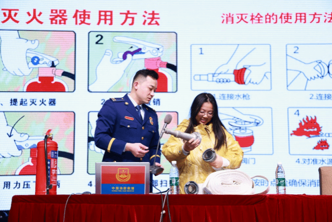 講座中,王奇峰副站長以豐富的專業(yè)知識和實(shí)踐經(jīng)驗(yàn),圍繞消防常識、防火技巧、滅火方法及火場逃生策略等多個(gè)方面進(jìn)行了深入講解。他結(jié)合生動案例,剖析了火災(zāi)的成因與危害,使同學(xué)們對消防安全有了更加直觀和深刻的認(rèn)識。同時(shí),他還現(xiàn)場演示了滅火器、安全救生繩等應(yīng)急裝備的正確使用方法,并邀請同學(xué)上臺進(jìn)行實(shí)操練習(xí)。