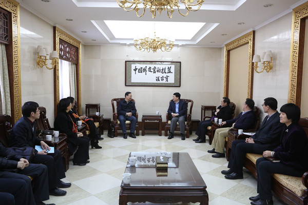 2016年3月14日下午,學校黨委書記李明舜、院長劉利群、副院長王練帶領學校辦公室、質量監控處等職能部門及院系教學單位相關人員一行18人,赴外交學院調研本科教學審核評估與“十三五”發展規劃編制工作。外交學院院長秦亞青、黨委書記袁南生熱情會見了我校人員。座談會由外交學院副院長江瑞平主持。院長助理、教務處處長高飛,學院辦公室、人事處、教務處及國際法系、國際經濟學院負責人參加了座談交流。